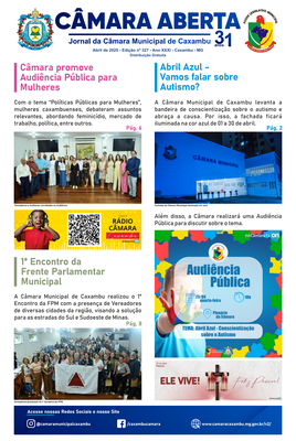 Jornal Câmara Aberta - Abril 2025 Edição nº 327 - Ano XXXI. Destaques: Audiência Pública para Mulheres, Abril Azul (Conscientização sobre Autismo), 1º Encontro da Frente Parlamentar dos Municípios. |