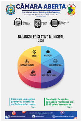Jornal Câmara Aberta - Dezembro 2025 Descrição: Edição nº 335 - Ano XXXII. Destaques: Balanço Legislativo de 2025, Ações da Escola do Legislativo, Prestação de contas dos Vereadores. |
