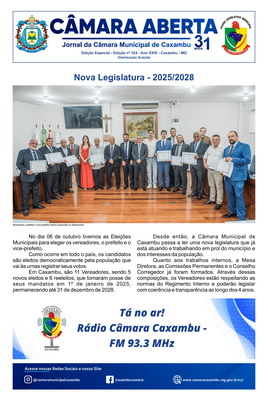 Jornal Câmara Aberta - Edição Especial (Janeiro 2025) Edição nº 324 - Ano XXXI. Destaques: Posse da Nova Legislatura 2025/2028, Eleição da Mesa Diretora, Inauguração da Rádio Câmara Francisco Simões. |
