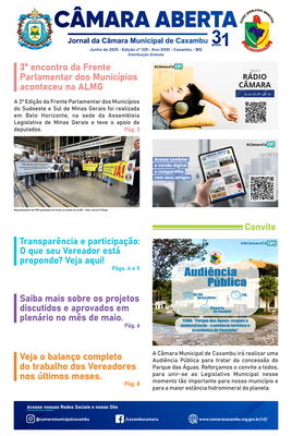 Jornal Câmara Aberta - Junho 2025 Descrição: Edição nº 329 - Ano XXXI. Destaques: 3º Encontro da Frente Parlamentar na ALMG, Audiência sobre o Parque das Águas, Projetos dos Vereadores aprovados em maio. |