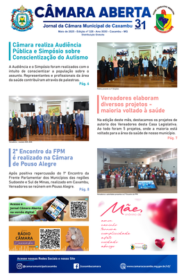 Jornal Câmara Aberta - Maio 2025 Descrição: Edição nº 328 - Ano XXXI. Destaques: Simpósio sobre Conscientização do Autismo, Novos projetos voltados à saúde, 2º Encontro da Frente Parlamentar em Pouso Alegre. |