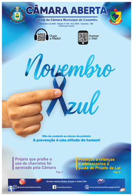 Jornal Câmara Aberta - Novembro 2025 Descrição: Edição nº 334 - Ano XXXII. Destaques: Novembro Azul, Aprovação do fim das charretes, Projeto de Lei de proteção a crianças e adolescentes. |