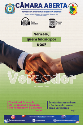 Jornal Câmara Aberta - Outubro 2025 Descrição: Edição nº 333 - Ano XXXII. Destaques: Posse dos estudantes no Parlamento Jovem, Tradicional Exposição de Fotografias, Outubro Rosa. |