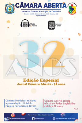 Jornal Câmara Aberta - Setembro 2025 Descrição: Edição nº 332 - Ano XXXII. Destaques: Edição Especial 32 anos do Jornal, Apresentação do Parlamento Jovem, Exposição Fotográfica dos 124 anos de Caxambu. |